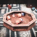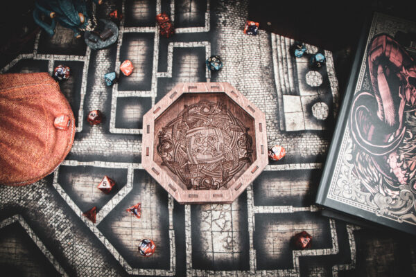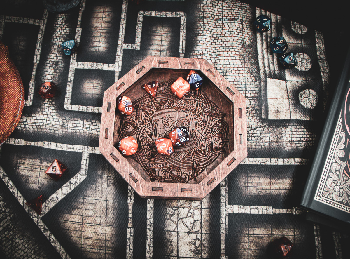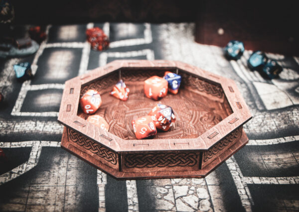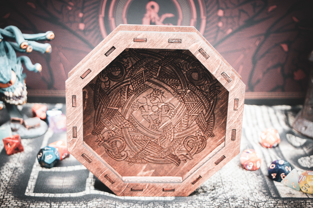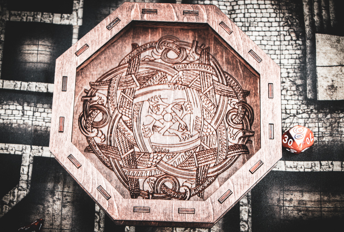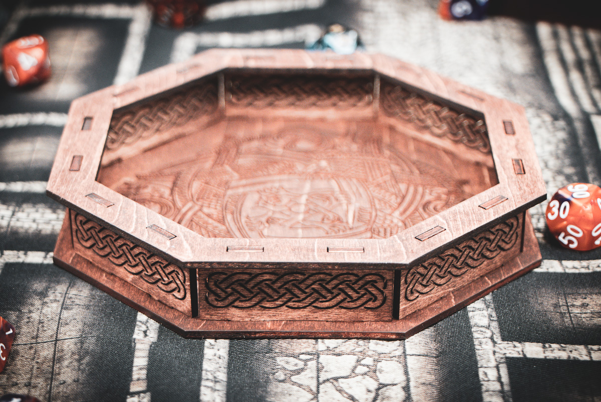 Stained in a rich Dark Walnut, the laser-etched birch plywood mimics the weathered timber of a Norse longship. The sides are adorned with two-stranded Celtic knot cutouts, allowing light to play across your rolling surface like sun through the trees of a Scandinavian forest. Whether you're playing a high-level Barbarian or a seafaring Cleric, this tray is a worthy vessel for your fates.