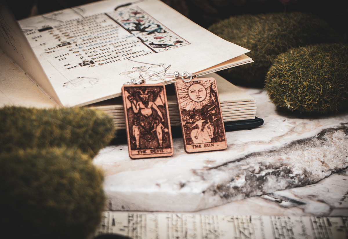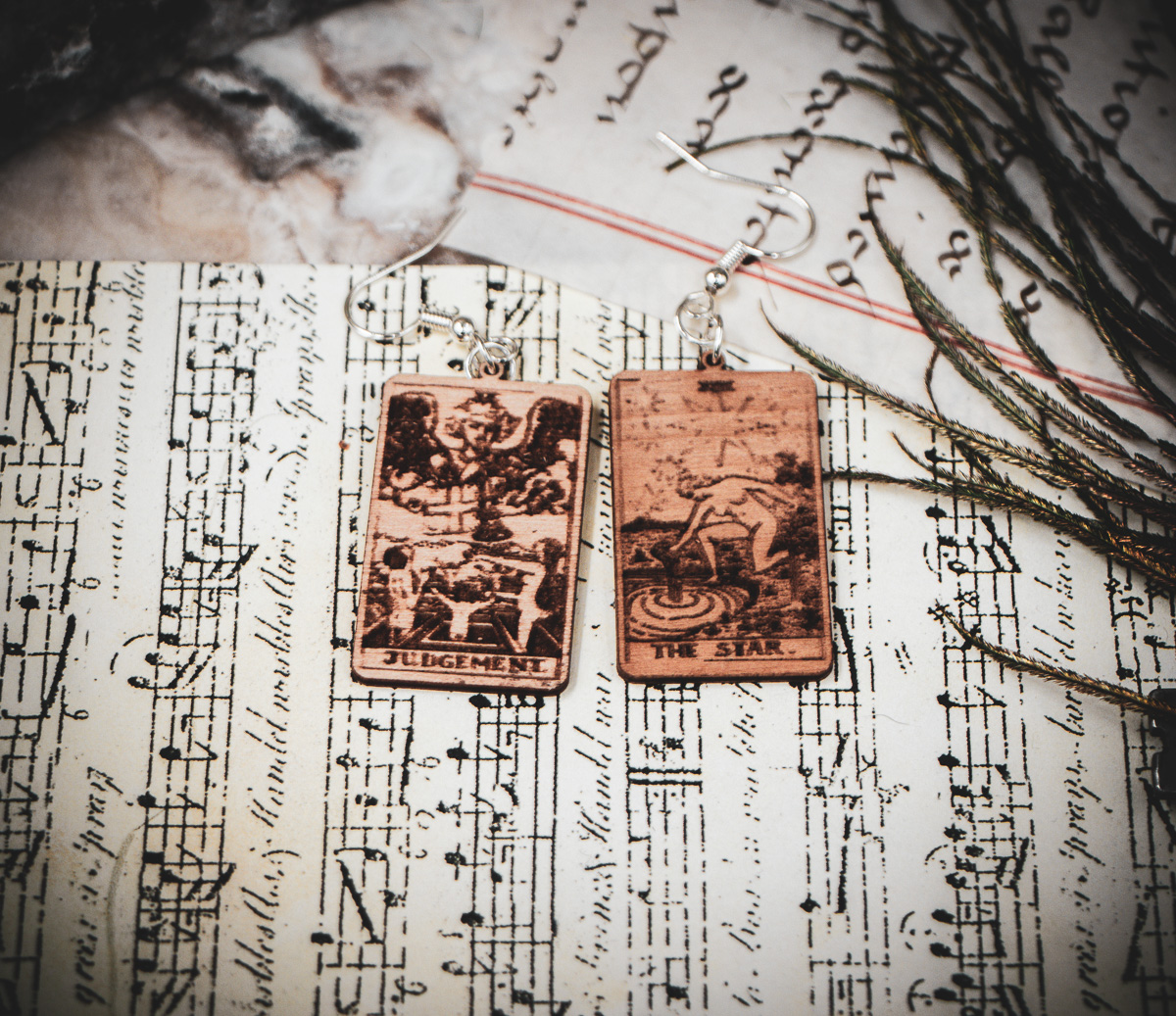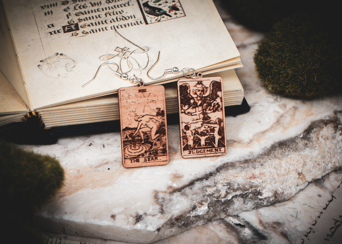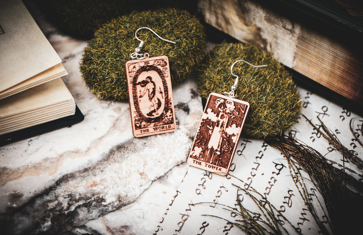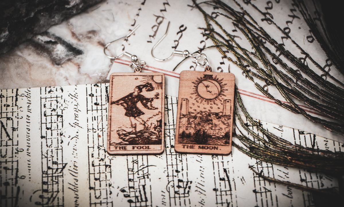 These earrings are designed to be "wearable woodcuts," capturing the stark, mystic linework of traditional tarot decks.