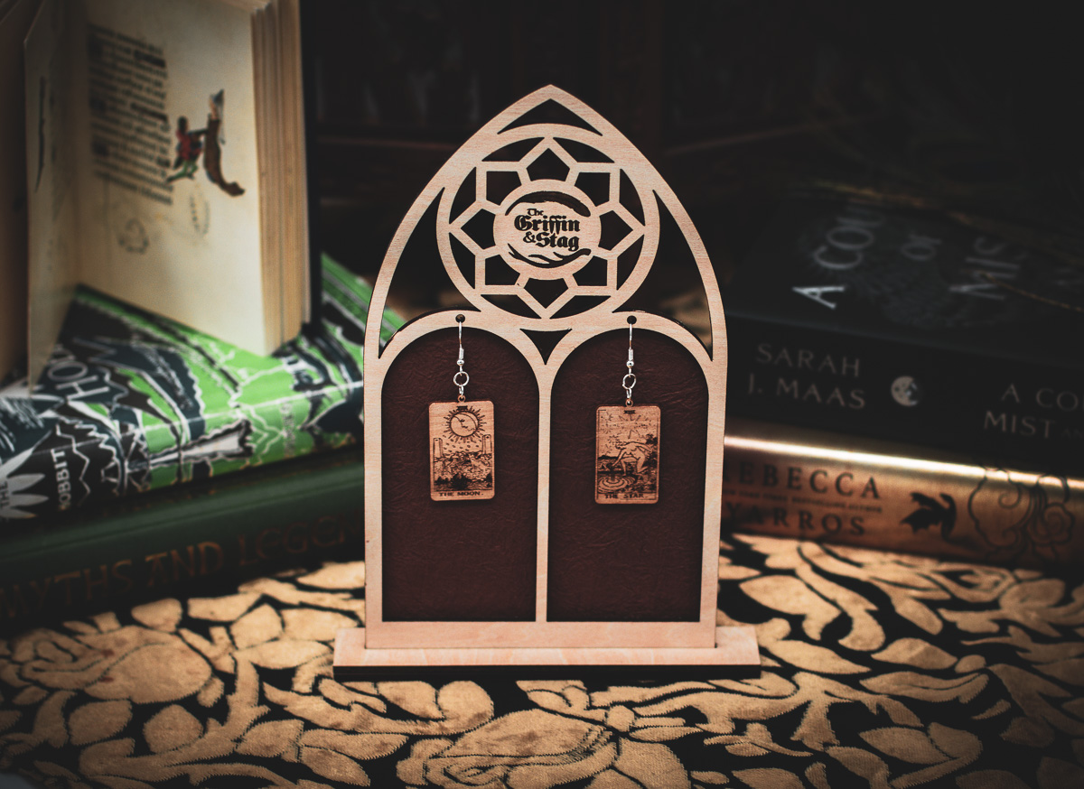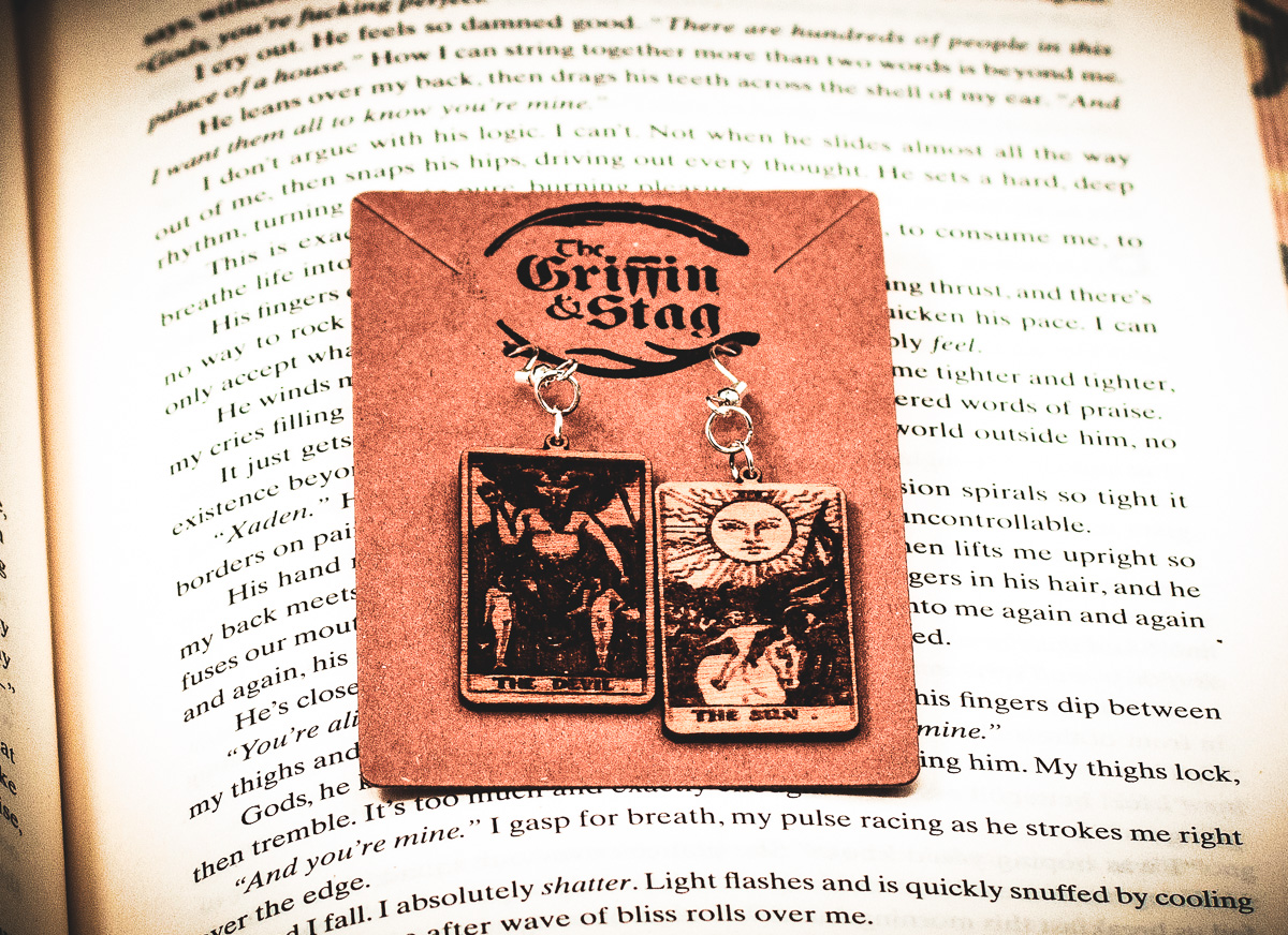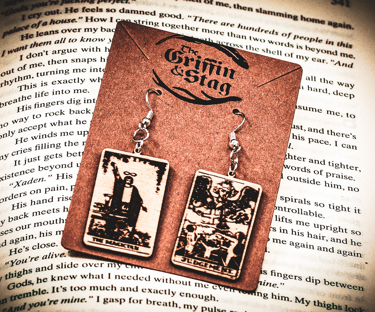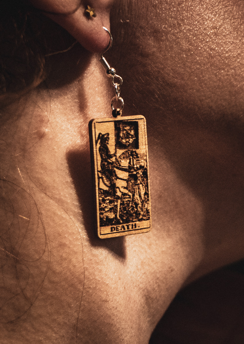 These earrings are designed to be "wearable woodcuts," capturing the stark, mystic linework of traditional tarot decks.