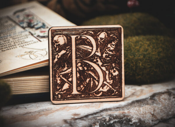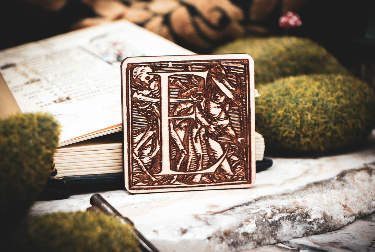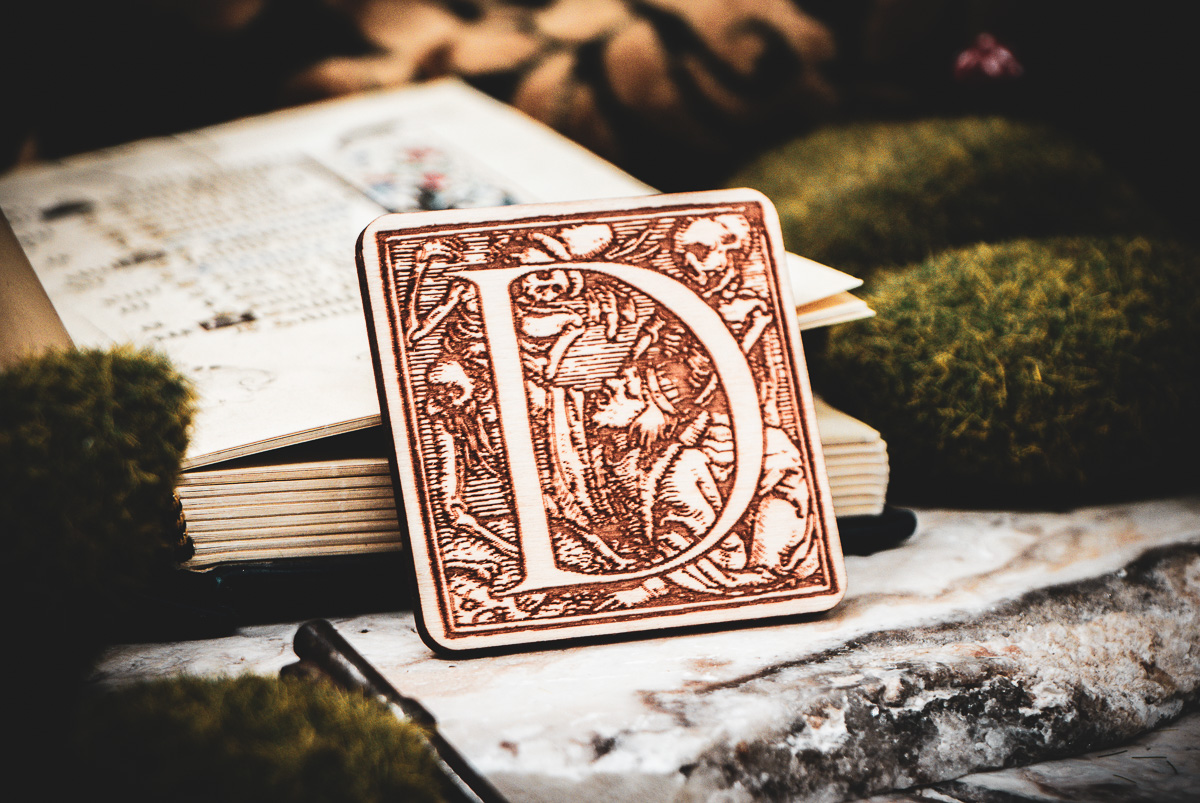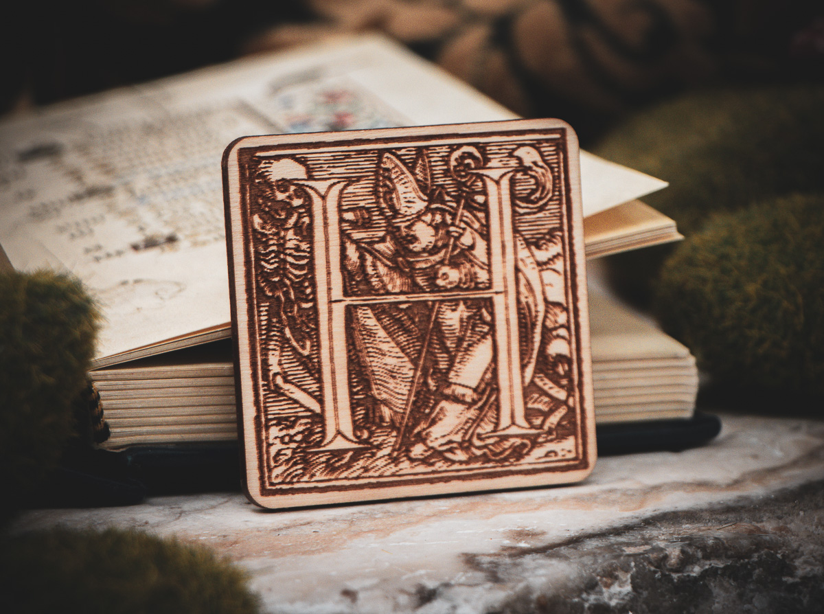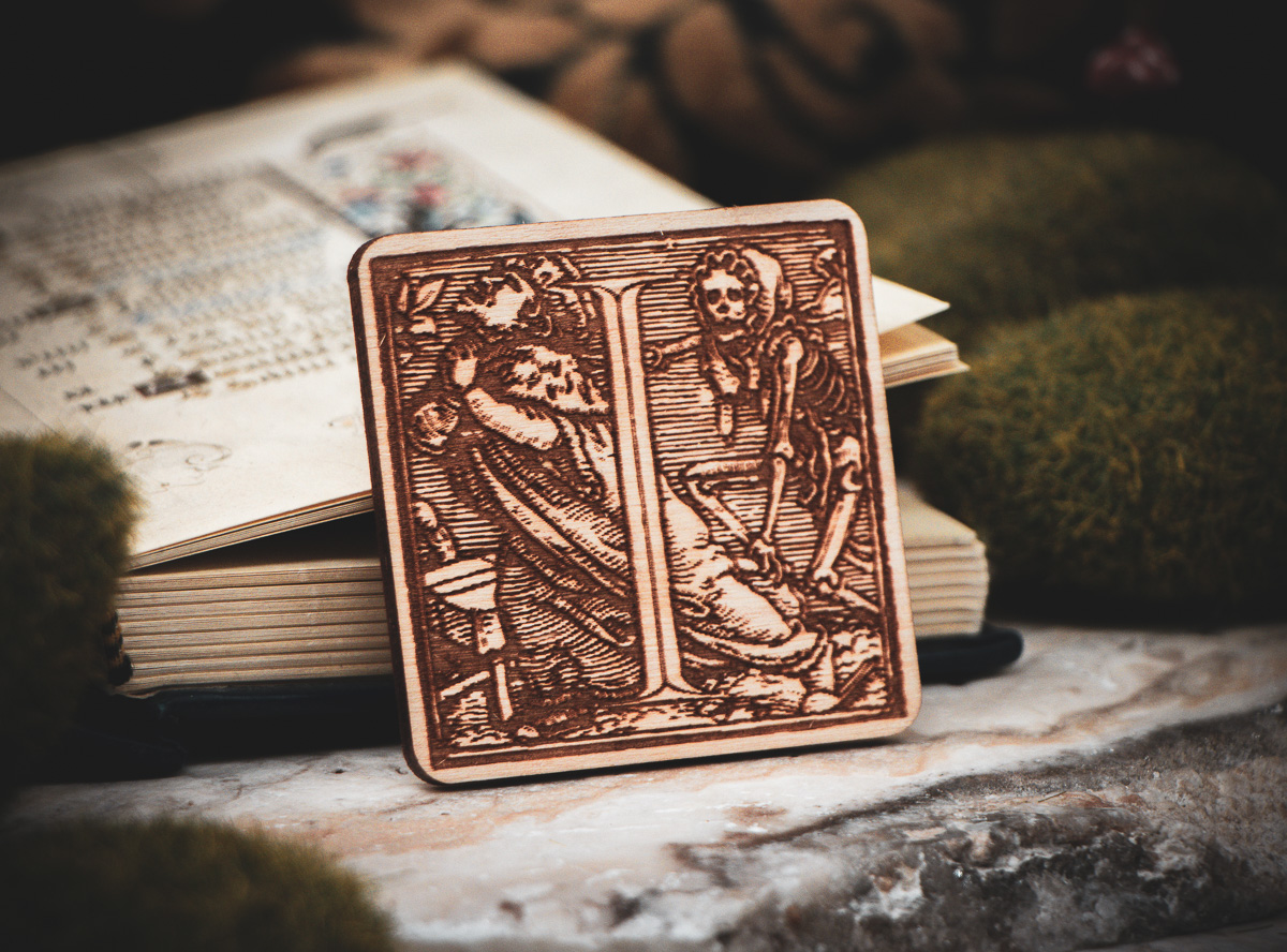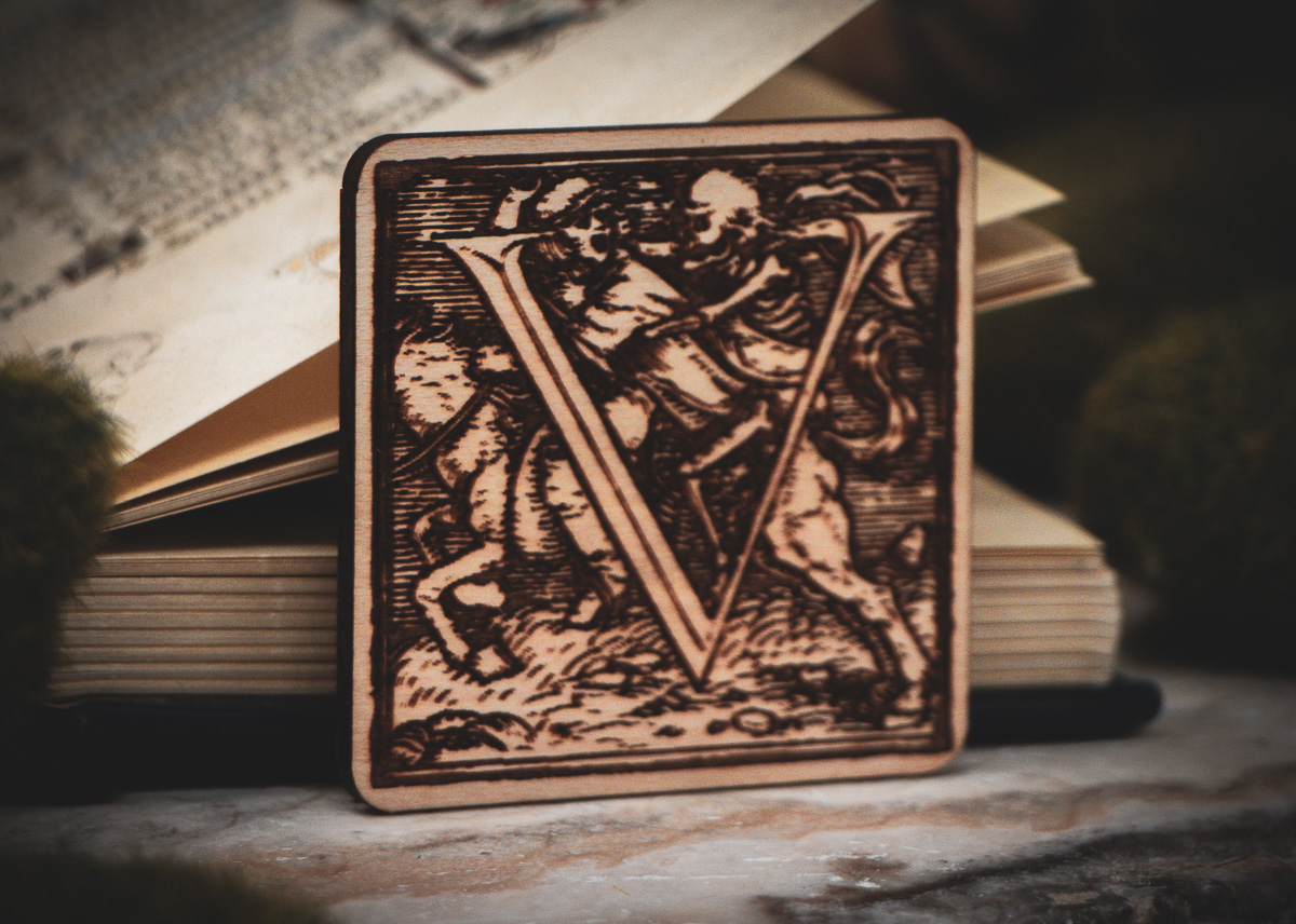 The Design: Authentic Renaissance woodcuts by Hans Holbein the Younger. Each letter tells a unique story of the "Dance of Death."